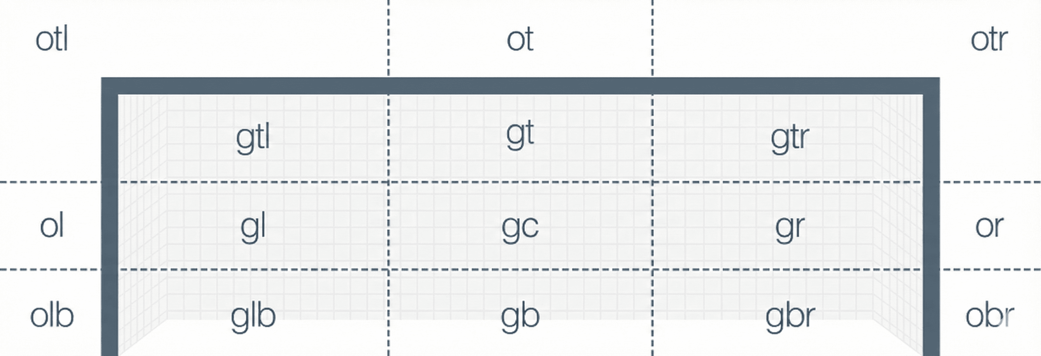 Shots on post are tagged as a shape of plt, where p replaces o of the corresponding angle. Shots on post that are scored are tagged with the corner of where they land in the goal. Blocked shots are tagged as bc (API tagId: 2101)